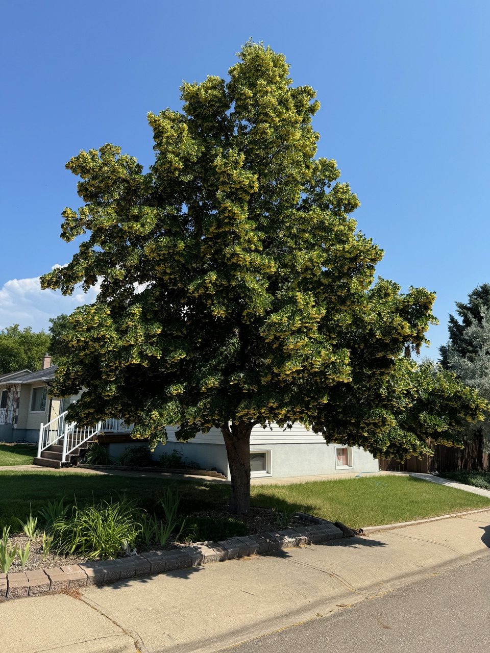 The Green Ash is a time tested and true tree for the prairies. They are amongst the hardiest of trees for our region. The tree boasts glossy dark green leaves that are pinnately compound with five to nine large leaflets. Autumn turns these leaves a golden yellow. The tree has greyish brown bark with interlacing furrows and ridges that produce a distinctive diamond pattern. Green Ash are cold, drought and urban tolerant making them widely suitable for any application. Green ash are native to South Eastern Alberta and have have been planted in our parks and yards since the very beginning.